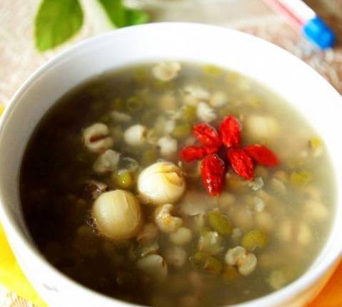 5、綠豆薏米粥:將15克大米,15克綠豆,15克薏米洗淨,加水熬粥。