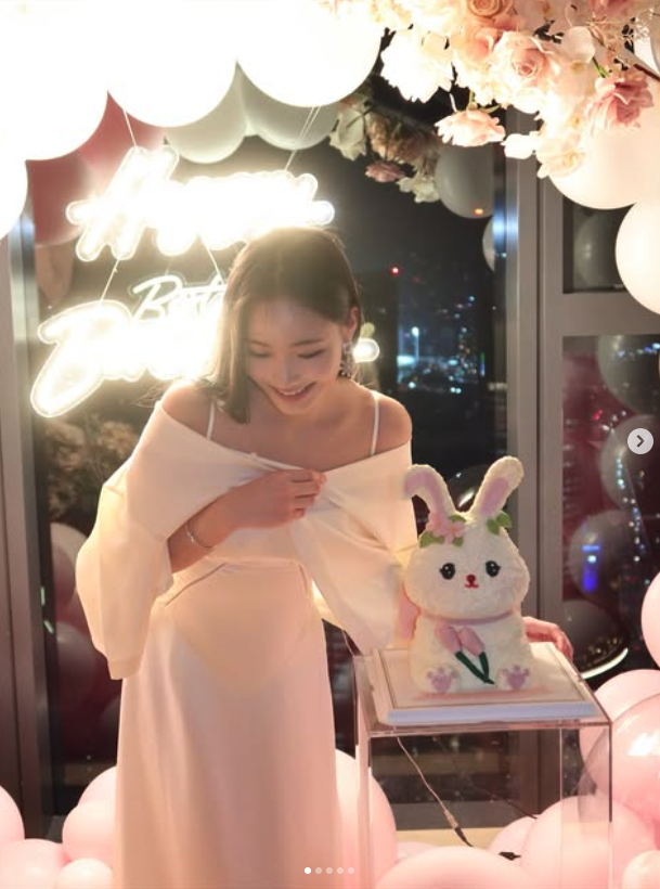 照片中的生日派對佈置充滿溫柔奶油白色調,Lily身著白色露肩長洋裝,站在可愛兔子造型蛋糕前,笑容甜美、仙氣十足,完全展現母親遺傳的清新氣質。夢幻濾鏡般的派對氛圍,搭配萌度破表的蛋糕,與她活潑形象完美契合,讓網友直呼美出新高度。