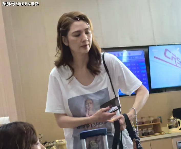 當天現身車站的洪欣穿的非常簡約,一件白色印花T恤搭配黑色長褲,這件短袖一看就是穿的時間長了,領口都被洗的寬鬆了很多,讓人覺得很有年代感。