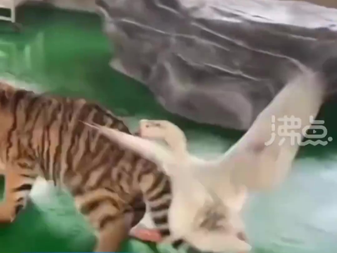 最後小虎狼狽地逃回籠子裡,才終於擺脫了大鵝,而大鵝嚇退小虎後則是昂首闊步、走路瞬間有風了起來,還開心地展開雙翅、張大嘴巴,彷彿在炫耀他的勝利一樣w而在一旁清掃的工作人員則目睹全程,笑稱大鵝比較厲害,並透露因為小虎才5個月大,雙方只是鬧著玩,沒有任何一方受傷。