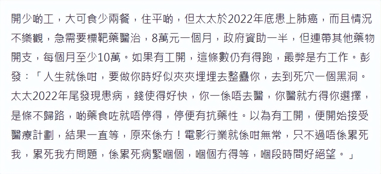 彭發透露,「彭氏兄弟」過去從來不擔心沒戲拍,2010年之後,恐怖題材電影走下坡路,兩人很少開工,仍可以支持日常生活,換了比較便宜的居住地點,太太在2022年不幸患上肺癌,情況不容樂觀,急需要靶標葯,每個月要8萬,政府資助一半,但加上其他的藥物開支,每個月至少還是要花10萬,一年要花上百萬。