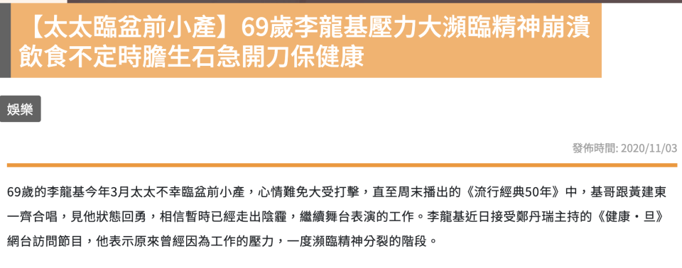 但就在2020年,李龍基還在一個節目里透露,太太不幸臨盆小產。