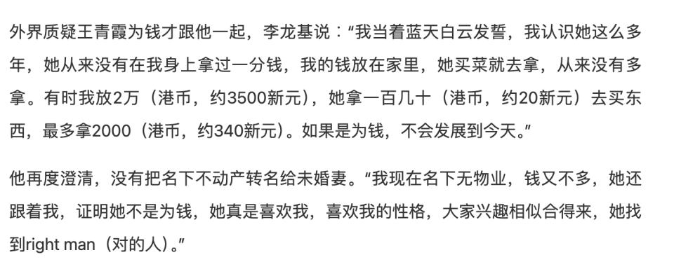 同時他還澄清,沒有把名下不動產轉名給未婚妻,強調自己名下無物業,對方還跟著他,就不是為了錢,而是真的喜歡他的性格,大家興趣相似合得來。
