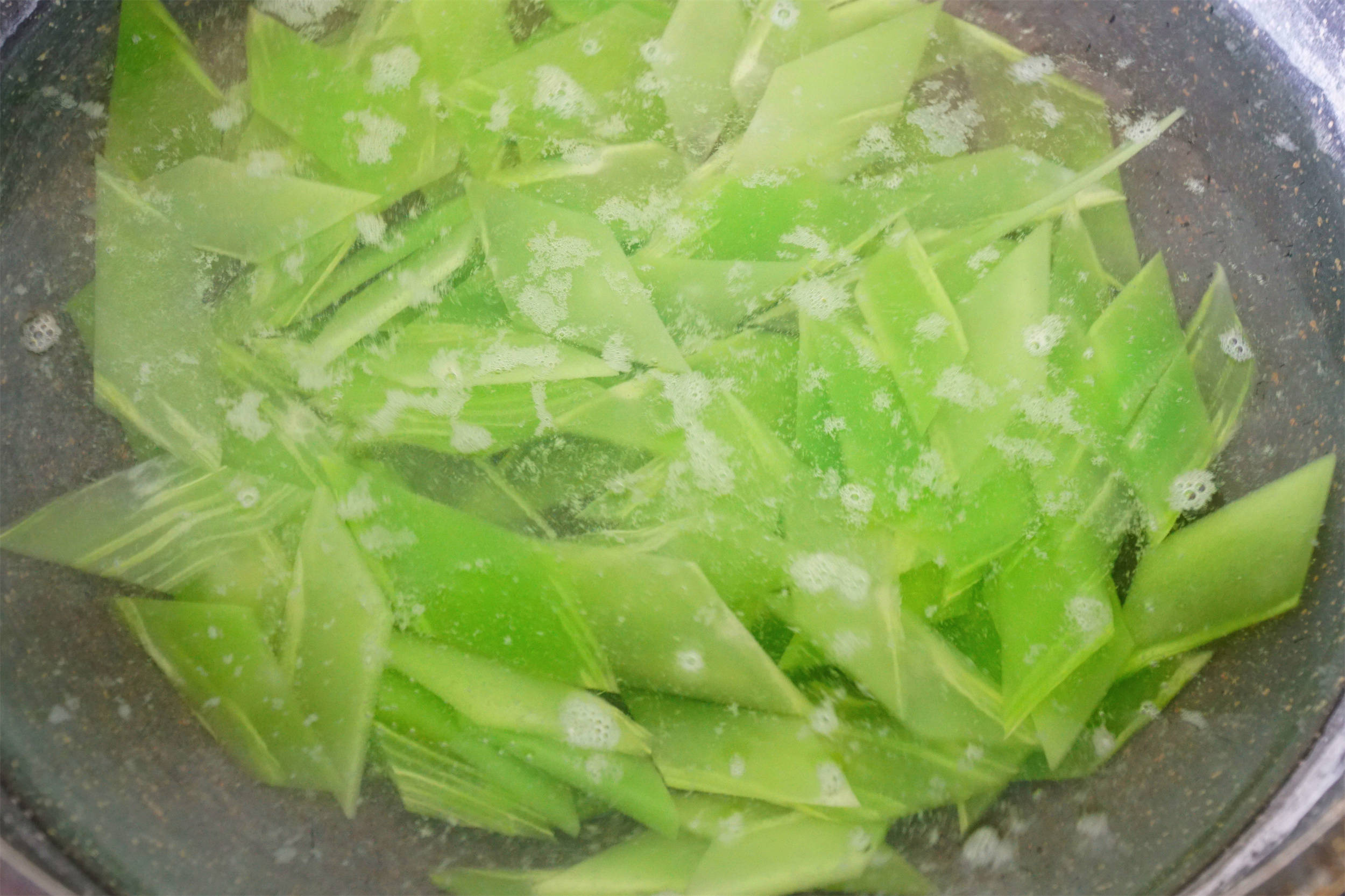 萵筍在削皮的時候,要記得從筍葉那端從上往下刮,而不是從根部由下向上刮掉表皮,根部的皮相對比較老比較硬,逆著刮反而會不順手,削起來比較困難。另外在給筍片焯水的時候,別忘了加鹽和油,可以讓筍片的顏色更清亮好看,但焯水時間不要過長,頂多一分鐘就好,不然筍片的口感就容易變得不爽脆。