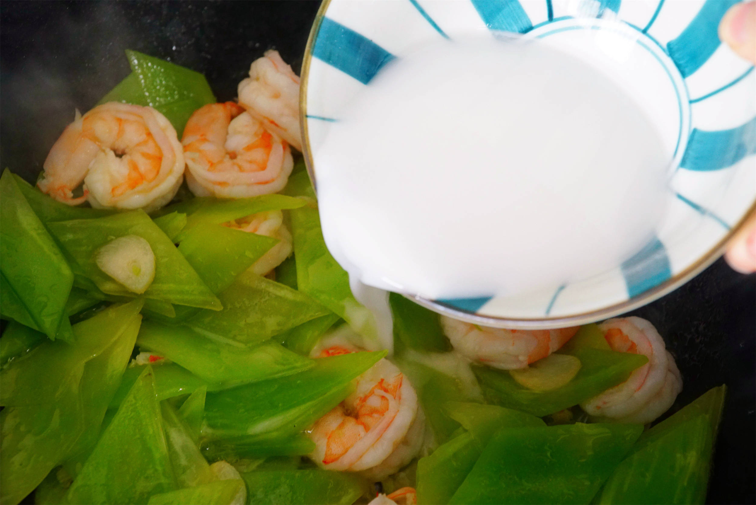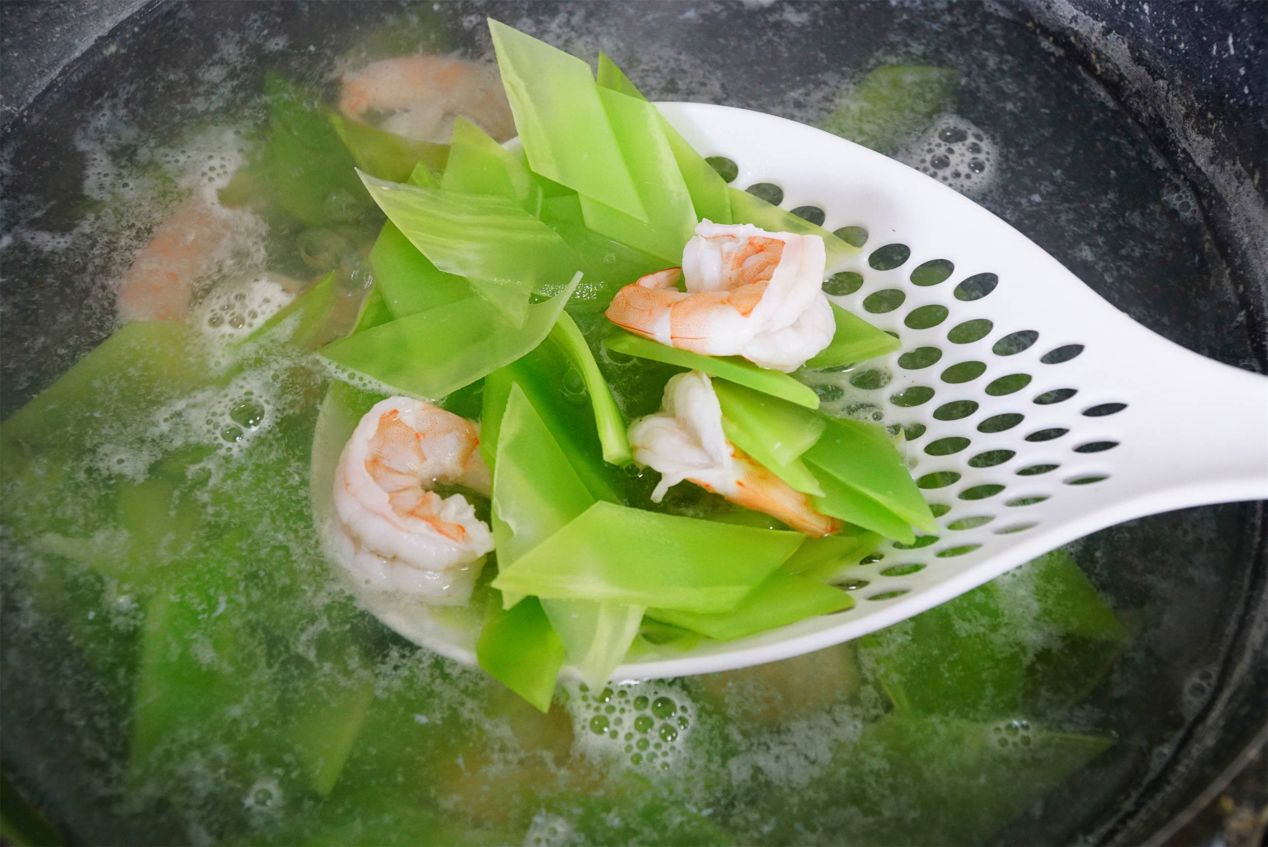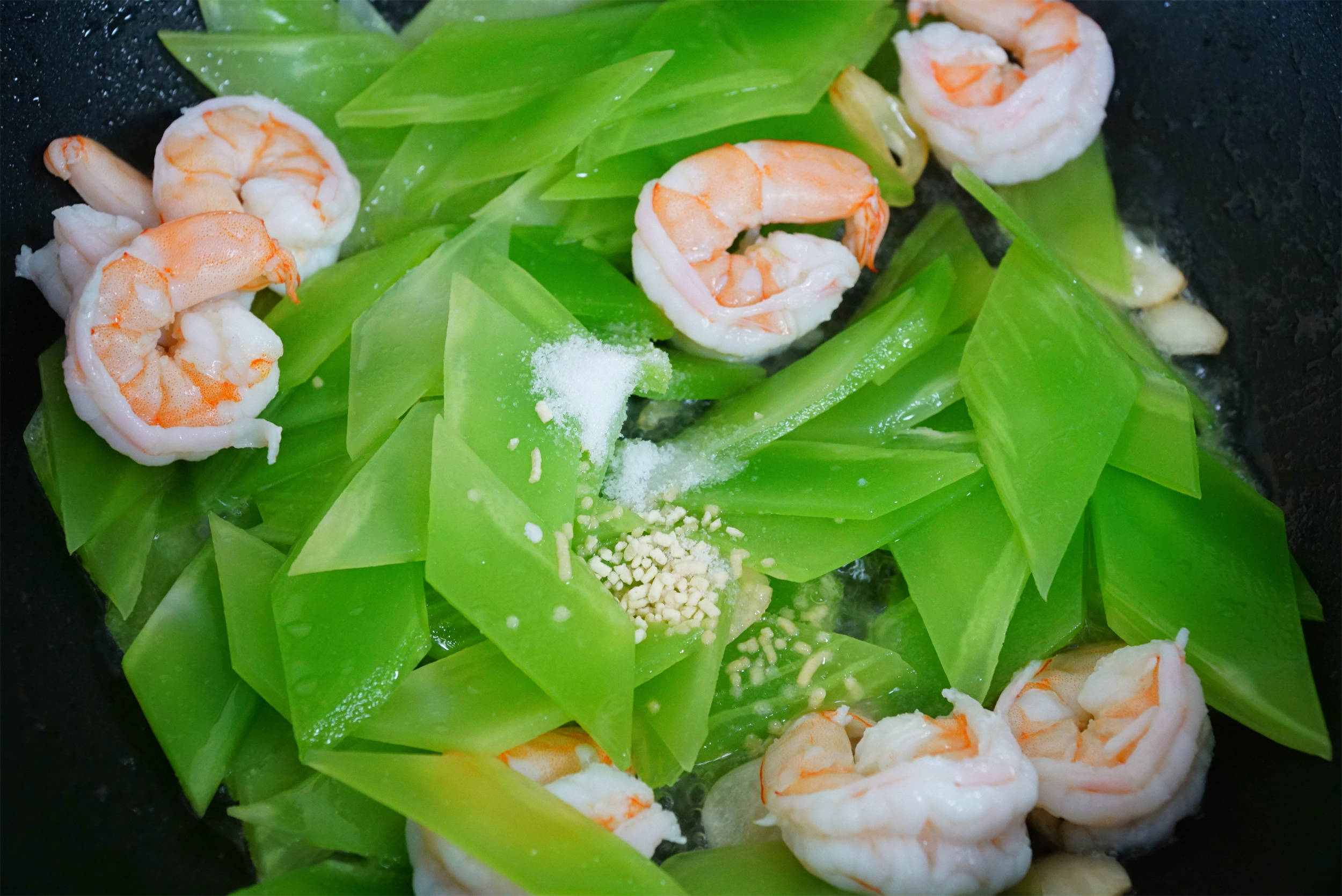 5、炒鍋燒熱倒油,放入蒜片煸香,倒入筍片和蝦仁,翻炒一分鐘,鍋中加入適量鹽和雞精。