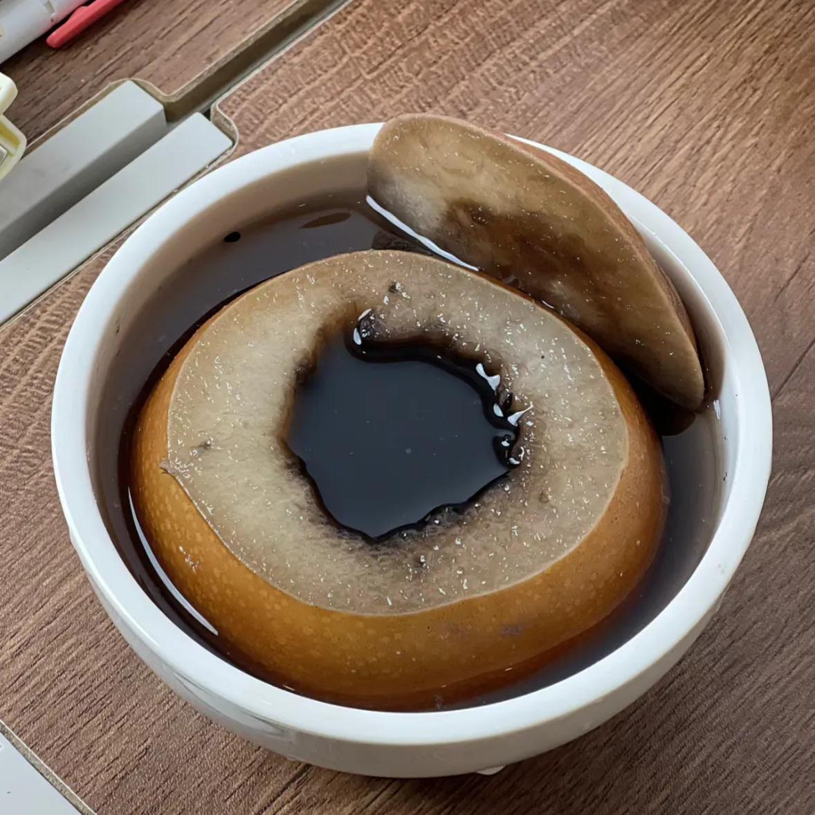 切出梨蓋,挖去梨核,加入黑芝麻,再蓋上用牙籤固定住,可以隔水燉,也可以像我這樣直接煮,吃梨喝水就可以,有點受寒ke嗽的,梨裡面再加一片陳皮,對於夜ke百試百靈!大人小孩都適用~