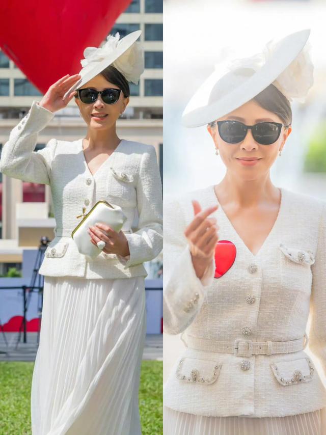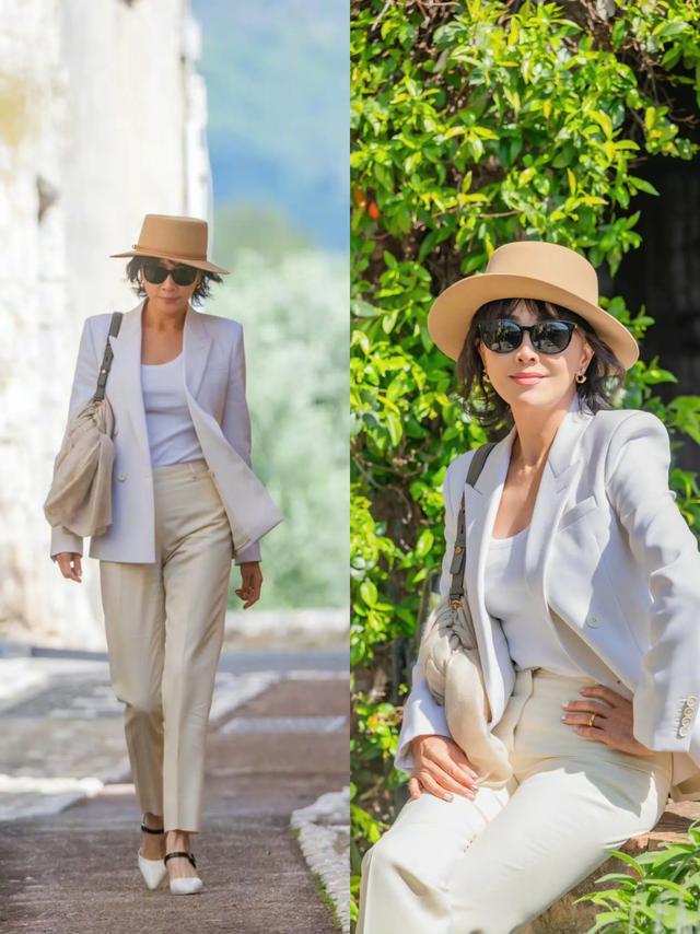 比如劉嘉玲穿西裝選擇內搭大圓領背心,可以拉長脖頸的長度,修飾臉型,搭配了遮陽帽讓人的視線上移,讓身材比例呈現縱向延伸,顯得更高!