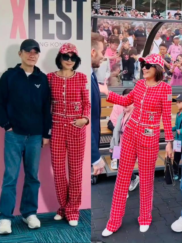 然而換成玫紅色格子套裝之後,劉嘉玲搭配了一頂同色系玫紅色格紋棒球帽,腳上搭配小白鞋視覺上平衡感恰到好處,竟有幾分甜美感!