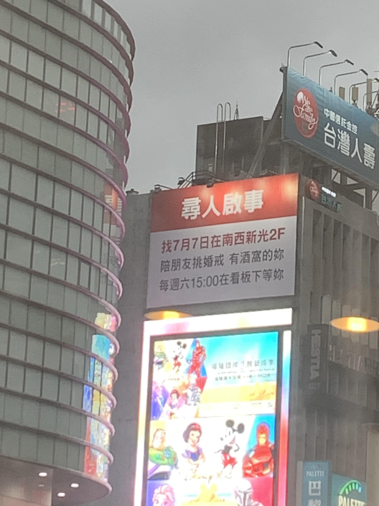 一名網友日前就在臉書社團《路上觀察學院》發文,他表示前幾天在路邊大樓看到一張巨大的「尋人啟事」廣告看板,上面寫著「找7月7日在南西新光2F,陪朋友挑婚戒,有酒窩的妳,每周六15:00在看板下等妳。」原PO也在貼文中打趣表示,「有酒窩的女生注意一下耶,就幫到這邊了。」
