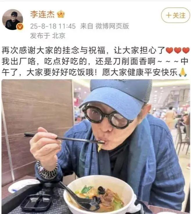 18日,李連杰在社交媒體上分享自己吃刀削麵的照片報平安,他對大家的關心表示感謝,並宣布「出廠囉」。李連杰發布的影片內容顯示,其目前已完成拆線。