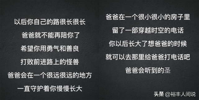 可是後來爸爸遇到了一個大怪獸,我很努力和它戰鬥了兩年半,但是爸爸還是輸了。以後你自己的路很長很長,爸爸就不能再陪你了,希望你用勇氣和善良打敗前進路上的怪獸,爸爸會在一個很遠很遠的地方一直守護著你慢慢變老。