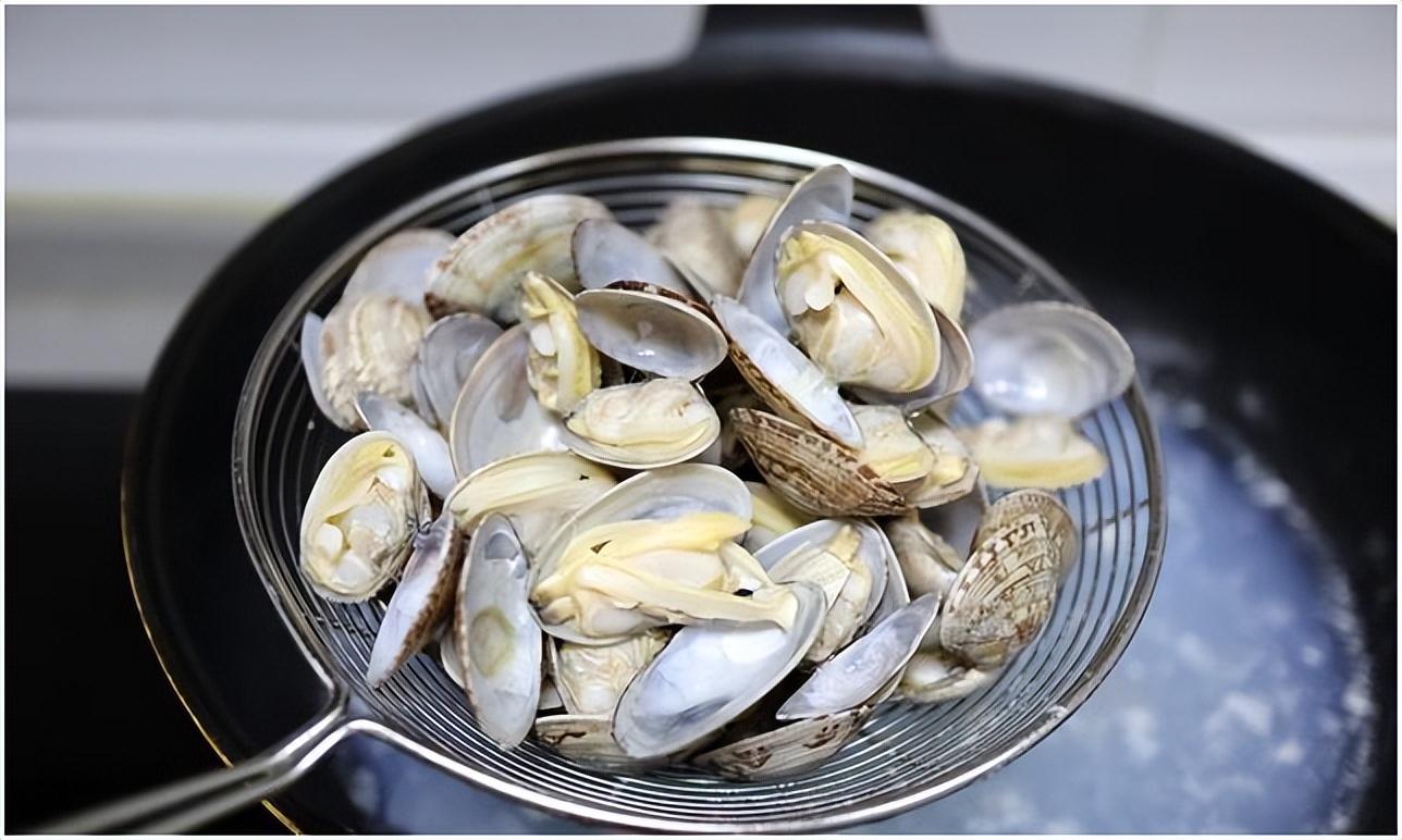 但是我們要注意,花蛤焯水的時間不要太久,花蛤張嘴后就要立馬撈出,因為我們還要再進行二次烹飪,焯水的時間久了,花蛤就會失去本身的鮮味,而且蛤肉也會變老咬不動!這個方法,最簡單、最直接,也最快速,但焯過水的花蛤,營養和鮮味都會有所減少。