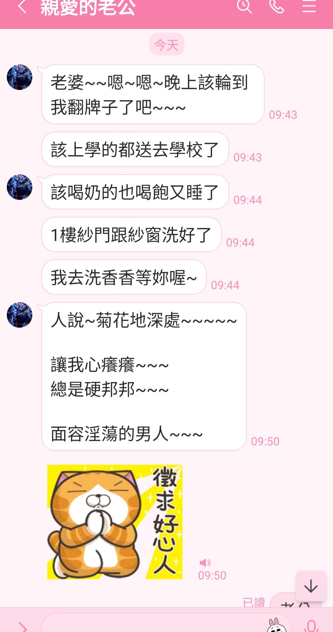 只見原PO與老公的對話框中,老公一大早9點43分時突然傳訊表示:「老婆~~嗯~嗯~晚上該輪到我翻牌子了吧」,並提到已經把家中小孩都安頓好了,「該上學的都送去學校了」、「該喝奶的也喝飽又睡了」,就連家務事也已完成,「1樓紗門跟紗窗都洗好了」,更語帶幽默又雀躍地說:「我去洗香香等妳喔」。