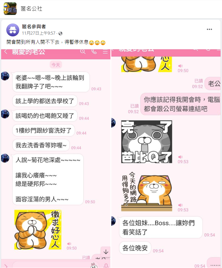原PO一看這些露骨又爆笑的訊息當場傻眼,不過正在開會中的她也只能冷靜回覆:「老公,你應該記得我開會時,電腦都會跟公司螢幕連結吧」,對方這才發現不妙、他傳的以上訊息都被看到了!隨即又快速傳來2張寫著「完了 芭比Q了」、「今天的網路用得夠多了」的貼圖,並傳訊表示:「各位姐妹...Boss....讓妳們看笑話了,各位晚安」。