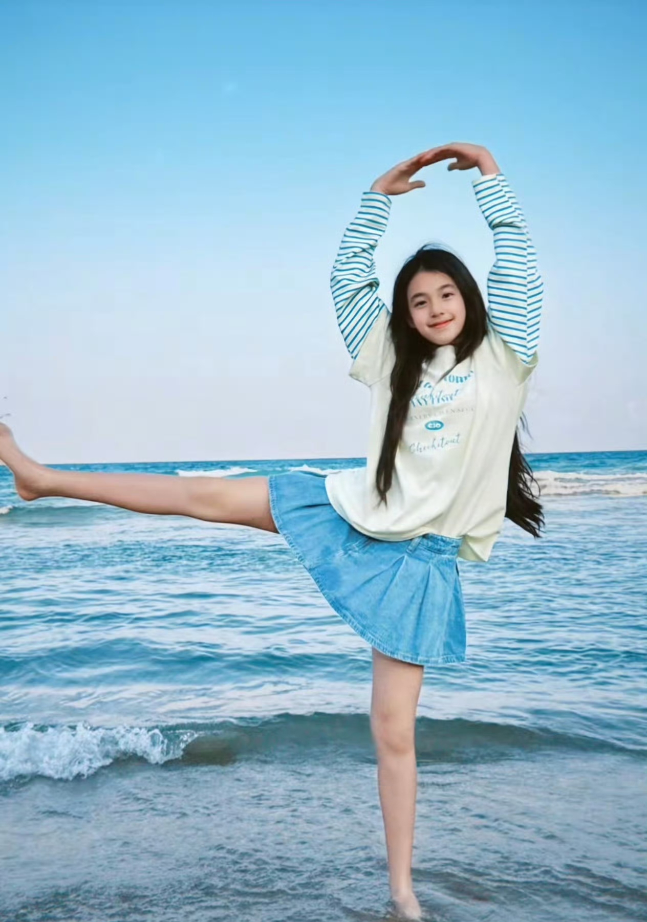 最近滑到劉畊宏曬出的近照,瞬間被這波顏值反差驚到——一頭烏黑長髮及腰,白T恤配牛仔短裙,身形挺拔修長,一雙大長腿格外吸睛。笑起來還是那個熟悉的淺淺梨渦,眉眼靈動乾淨,從當年圓乎乎的萌娃,徹底蛻變成了清爽明媚的元氣少女。