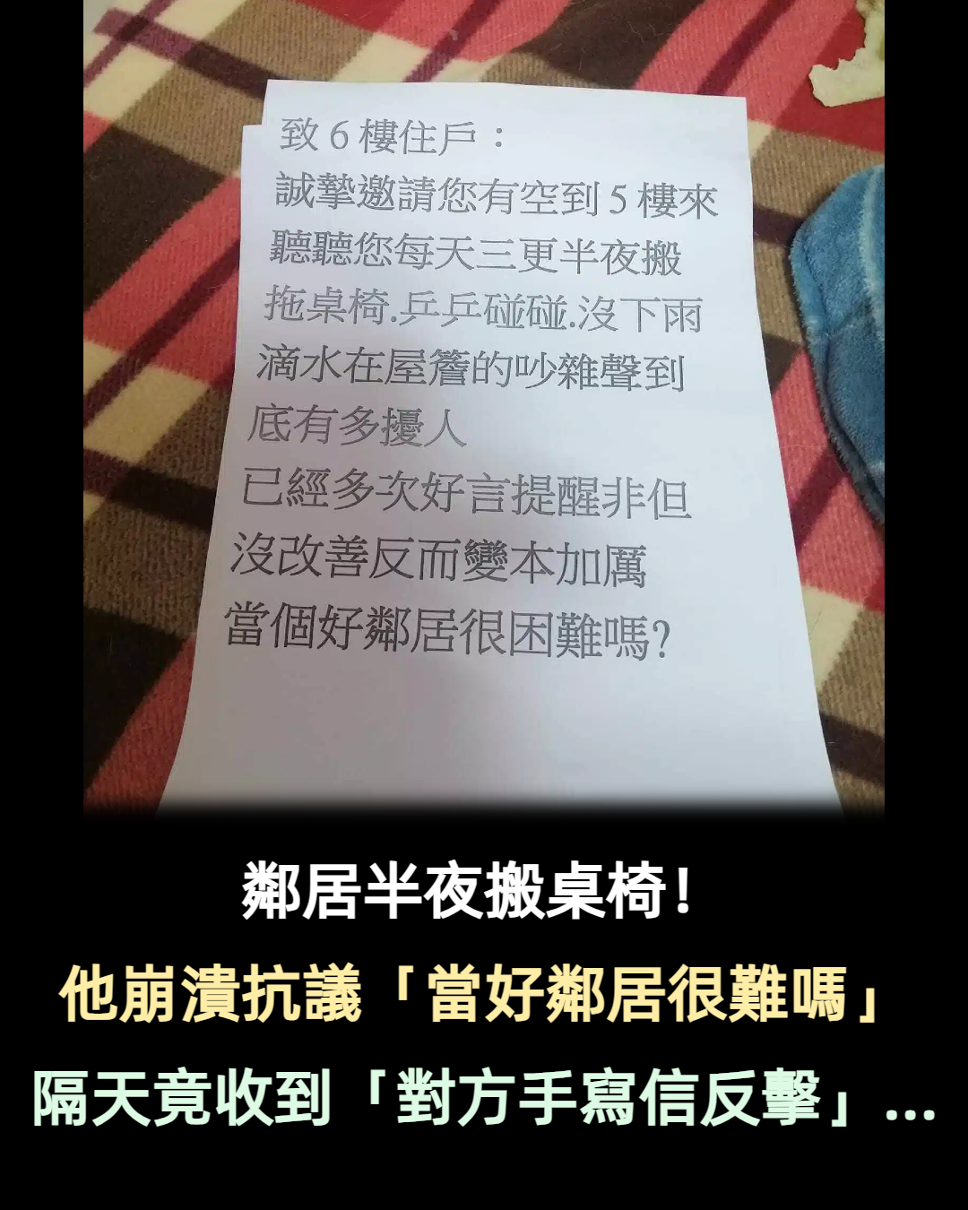 鄰居半夜搬桌椅!他睡不著崩潰「寫信貼公告欄」:當好鄰居很難嗎 隔天竟收到「長長手寫回信反擊」 芒芒果凍 2026-04-28 檢舉 大家也有遇過吵鬧的鄰居嗎?但小編真的建議還是以和為貴、一起找出解決辦法比較好~來源:爆怨公社 Advertisements 回首頁 2/2 Advertisements 猜你會喜歡 從飛機事故中倖存!夫妻自拍上傳「開心喊1句話」 網友傻眼罵「有人意外離世欸」2方戰翻 沒人聽得懂!她問晚上「要不要去熊電」大家霧煞煞 南部人跳出來解答「小時候很愛去耶」 編輯精選推薦 More + 超準統計出爐!愛出軌男人「名字最常出現這6字」:有這字完全禁不起誘惑 有望超越輝達!這公司「撿到大砲」將成最賺錢公司 「賴習會」解兩岸僵局?民調出爐「結果驚人一面倒」 國稅局窗口「必放一罐麥茶」要幹嘛用?內行人「揭開驚人用途」網嗨:馬上買來放 毛孩是家人!這國家宣布「人寵合葬合法化」網超感動 快訊/國民黨老將「宣布脫黨參選」:實在是狼狽 快訊/火車驚傳相撞「嚴重死傷」人數曝光!生還者淚憶「瞬間被壓成一團」 基隆獨居男「陳屍家中」!門口「貼一張紙條」警察嚇傻不敢進去 死後骨灰怎麼葬才好?這3種葬法千萬別選「無法超生還會禍及子孫」 事業風光情路坎坷!77歲女神「渣夫出軌還求復合」 她單身至今「被偶遇驚天一幕」:根本反人類 照顧中風婆婆3年!婆婆離世後「老公狠心提離婚」 她1年後「得知真相」哭求復婚 85歲失智父身亡!林葉亭突宣布「皈依佛門」 遇大師「開示一番話」忍不住淚崩 年拍200部劇!偶像劇男神「慘失業沒戲拍」:回家種田 夢幻神獸現身!他偶然拍到「首隻白色幽靈」驚豔全球 專家曝真實身份:「已經瀕臨絕種...」 戴珍珠耳環的寶寶❤攝影師媽媽「把女兒拍成世界名畫」 變身「壞壞版蒙娜麗莎」超Q表情融化全網 男生不願娶的女生職業排行公布!男坦承:第一名幾乎從不考慮 只是因為一盤蚊香!一家三口驚傳「全數斃命」 快訊/49歲王俐人無預警宣布「加入成人平台」 民眾黨「創黨元老過世」!妻證實:還催繳黨費 快訊/台南爆「母子3屍」!躺在一起「身旁擺了1瓶」 快訊/再度點名台灣!川普宣布「將奪走50%」 台積電財報曝訊號!專家點名「3檔股票」快上車:要起飛了 35歲OL正妹「11年相親300人」沒人要!網驚呼不可能「一看2條件懂了」 快訊/台灣旅行團赴中「1死12傷」!陸委會緊急發聲 新北市長支持誰?最新民調結果驚人「這人大幅領先」