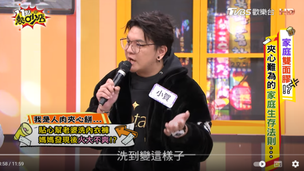 根據《ETtoday星光雲》報導,賀一航之子曾治豪與初代《我愛黑澀會》美眉Meggy,於2023年8月結婚後,常在社群媒體分享生活點滴。近日他在節目《11點熱吵店》分享一段趣事,竟因為幫另一半洗貼身衣物,意外引發家庭風波。