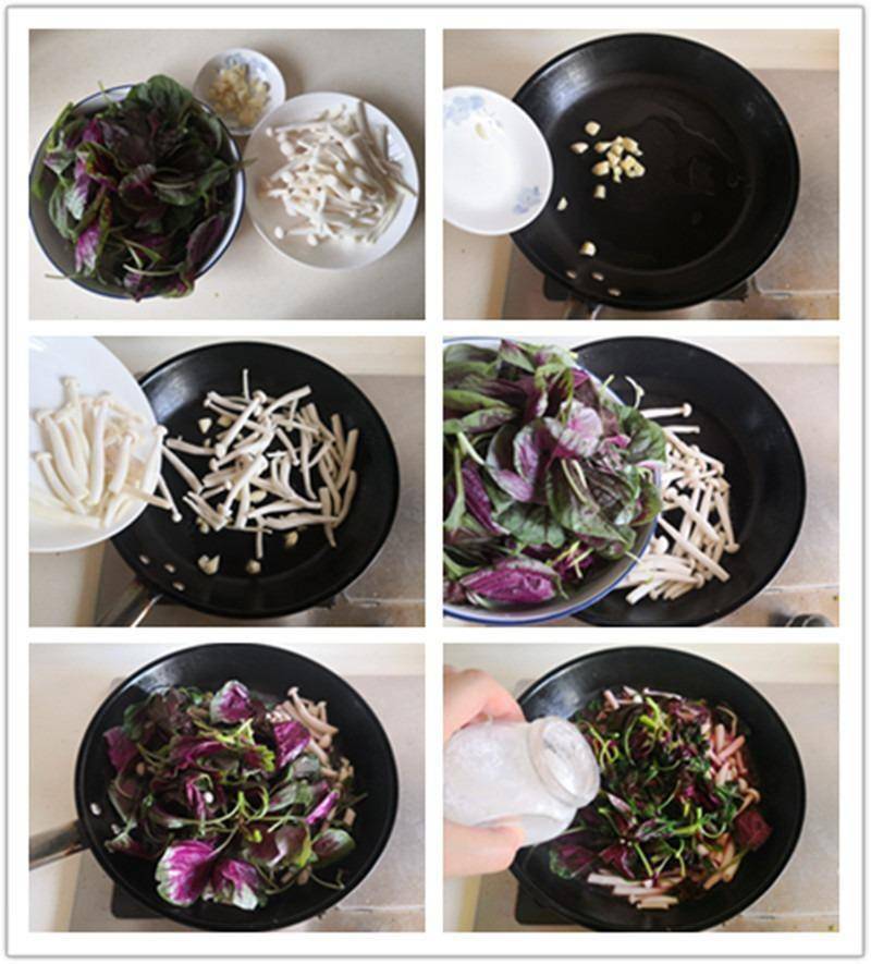 料理小撇步:1. 先放入鴻喜菇進鍋去炒,炒至微微變軟; 2. 加入洗凈的莧菜進鍋大火快炒,避免營養的流失。