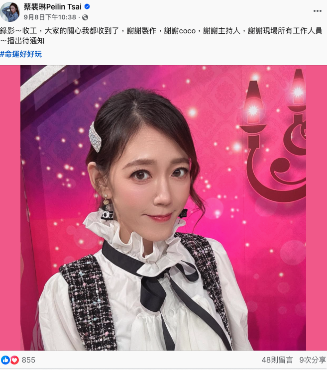 41歲的裴琳在臉書分享復出的喜悅,貼文中提到「錄影,收工」的字句,並特別感謝製作人員、主持人和所有工作人員的協助。對於能夠重返螢光幕,她心懷感激,並表示會在節目播出時再次通知大家。貼文一出,眾多網友紛紛獻上祝福,其中女星唐玲也在留言區稱讚她「很漂亮」。