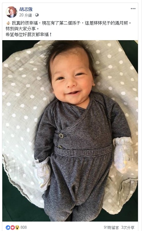 胡志強代替女兒受訪,表示女婿體貼、為人踏實,除了照顧老婆、孩子外,白天還要上班,晚上照顧兒子的責任也沒有讓給別人過,大讚對方:「愛這個Baby愛到難以形容!」如今QQ已經滿月,只要醫生點頭,就會全家帶回台灣,跟娘家相見歡~