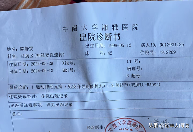23年一場A流過後,靜雯發現自己的胳膊怎麼都抬不起來,起初認為是肩周炎。直到完全抬不起來,這才選擇去醫院,檢查結果讓其頓覺天塌了,確診神經元病,因為怕誤診,所以她前往更高級別的醫院,沒想到最終還是難逃厄運,也就是所謂的漸凍症。