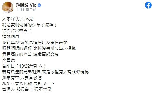 據《三立新聞網》報導,游勝綸20歲就開始在市場工作,每天凌晨就起床上工,加上媽媽被診斷出食道癌,他一直扛下醫藥費,也分出時間去照顧媽媽,前陣子就一度休攤半年,只希望好好照顧母親的身體;日前許久未現身的游勝綸,也罕見發文,跟大家透露照顧媽媽的過程中,看到癌症的痛苦,讓他內心百感交集,也很不捨母親的遭遇。
