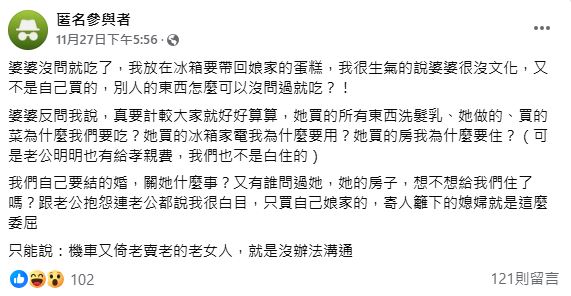 原PO認為,婆婆才是問題所在,「只能說機車又倚老賣老的老女人,就是無法溝通。」該貼文引來大量網友留言,意外的是,大多數人都站在婆婆這邊,反批評人妻毫無家教、又雙標「公主癌很嚴重~」、「妳是不是無法反駁?」、「沒能力搬出去只能蹭家真好笑。」、「婆婆不知道是妳買的蛋糕,但她說的話妳也無法回擊。」