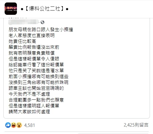 雖然說在馬路上遵守交通規則,可以保護自己也保護其它人,但有時候真的會沒注意,如果發生事情,後續要怎麼處理,除了報警之外也可以私下協調,日前就有網友在臉書社團「爆料公社」發文說,他朋友的老母親日前在路口沒注意,不小心A到另一台機車,當下發現前土除跟燈殼壞掉,老人家覺得自己理虧也馬上道歉,並表明願意付修繕的費用,互相留下聯絡方式,孰料幾天後,對方的行徑,卻讓家人都看傻眼。
