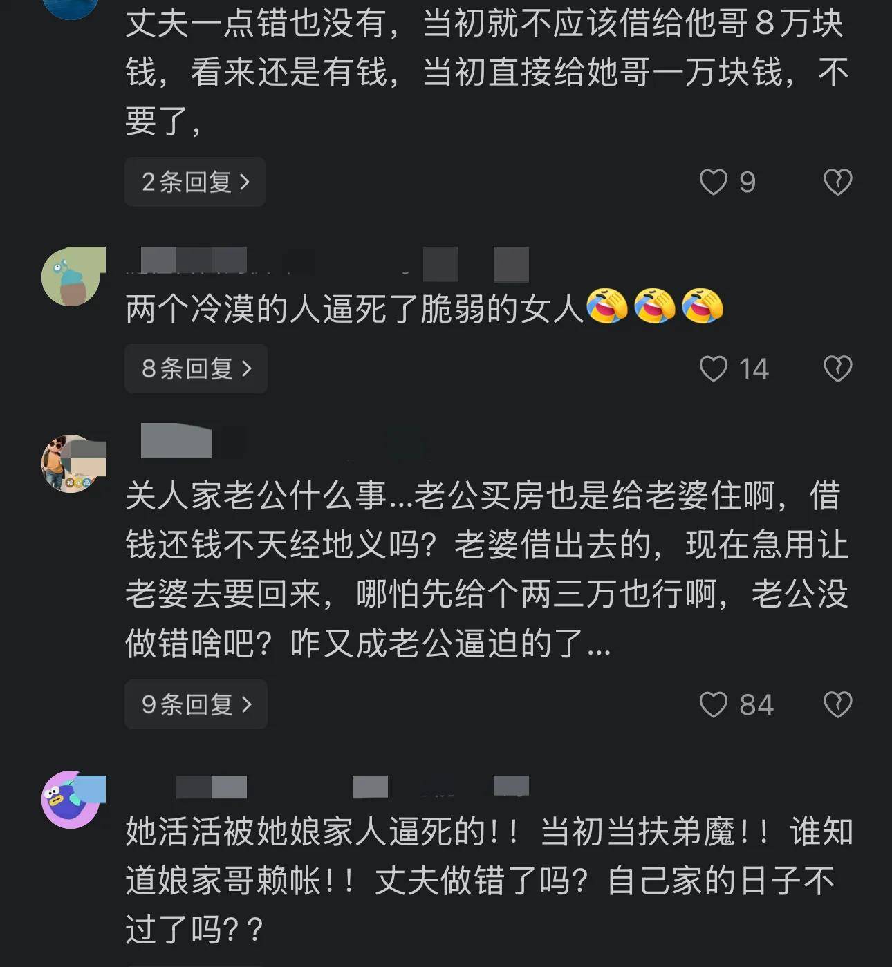 對此,有很多網友也展開熱議,一位網友說,她的哥哥就是罪魁禍首,借錢不還還這麼有理,這樣的親人還不如沒有。也有網友說,雖然此事太令人氣憤,可是該女子的心理承受能力也太差了。錯又不在自己,哥哥不仁,你也可以不義,通過法律手段要回來就是了,太傻了!