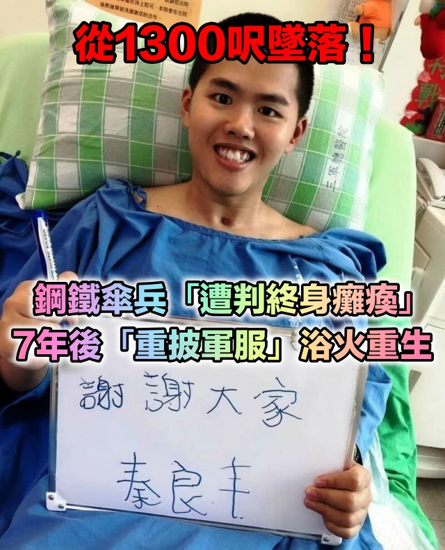 軍方同意,未來將讓秦良丰轉任國軍醫院心輔工作,以新身分服務國軍。而去年秦天人曾在臉書分享影片,畫面裡,秦良丰已可在無旁人攙扶下、緩步向前,秦天人感動寫道:「期待明年的春天你會有更多的進步和突破,繼續加油!」網友們也送上祝福:「指日可待。」、「步步艱辛,步步勵志。」、「越來越棒了~」、「爸爸媽媽辛苦了。」