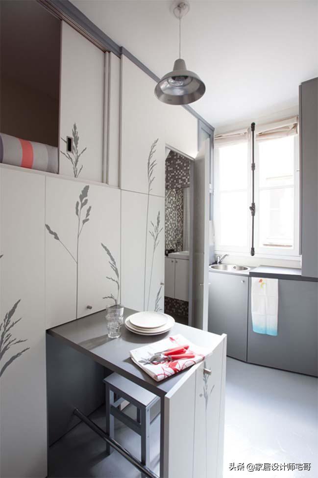 下面則是巧妙地設計成了一個小餐桌,餐凳是可以掛放收納到餐桌檯面下方的。