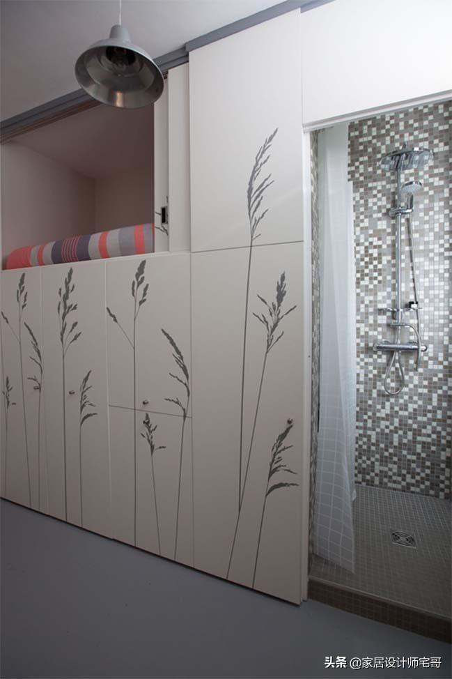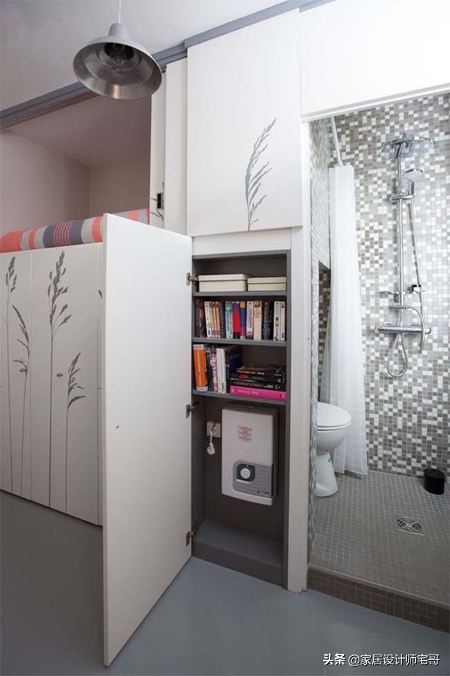 在過去的柜子裡面也是做了收納,放置一些書籍,下方還內嵌了一個電熱水器,疲憊的工作一天回家後,能洗上一個熱水澡,真的很愜意。