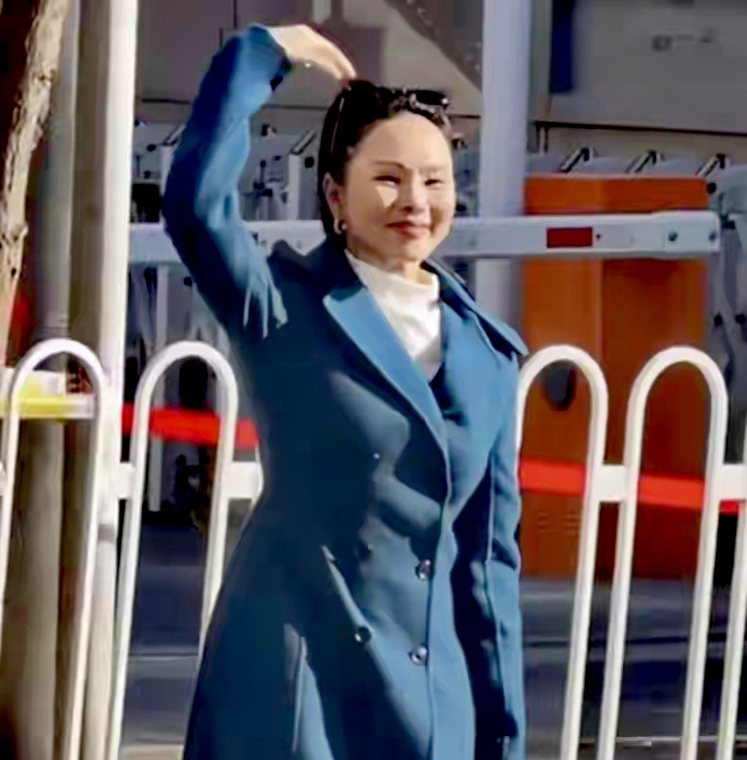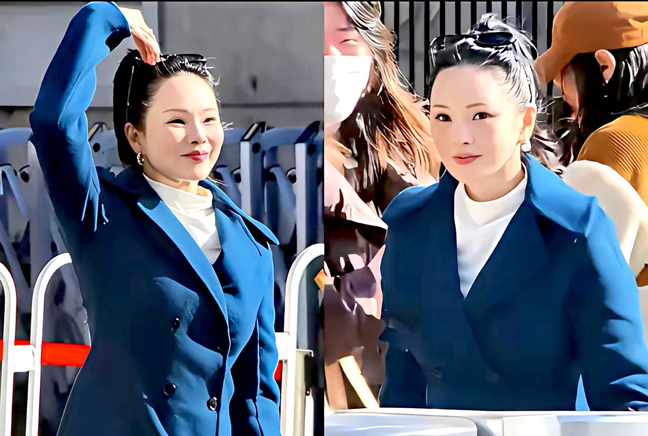 57歲的伊能靜那天穿了件深藍色大衣,妝容挺精緻,還架著副墨鏡。可能是想顯得幹練精神些,她把頭髮全部往後梳,弄了個「大光明」髮型,整張臉一點遮擋都沒有。