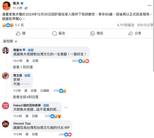 魚夫的家屬於今日(1/1)透過其臉書公開他已於12/30離世的消息,這位備受敬重的漫畫家已在家人陪伴下安詳離世。這位見證台灣政治變遷的文化工作者,用畫筆和智慧為這片土地留下珍貴的時代印記。台南市長黃偉哲得知消息後也表達深切哀悼,承諾將依照家屬意願協助處理後事。