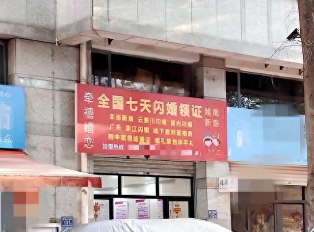 看完了上面的新聞,還有另一件耐人尋味的事。有人發現,街頭巷尾突然出現了不少打著「閃婚」旗號的宣傳廣告,其中最引人注目的就是承諾一周內完成結婚登記。