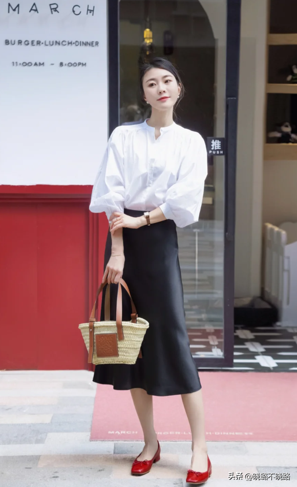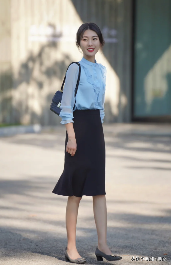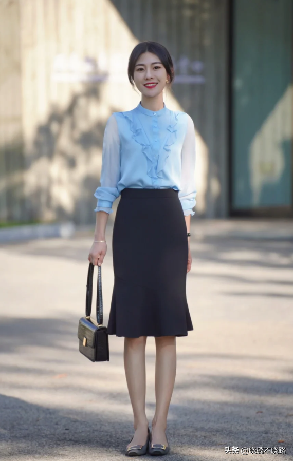而魚尾裙的搭配上半身的單品選擇也有著一定的高標準,在這裡推薦大家選擇上衣搭配的時候,還是盡量要使其修身化,也就是比較貼合身形,一些整體的輪廓感是趨向於煙管和略微鬆弛一些的狀態即可。