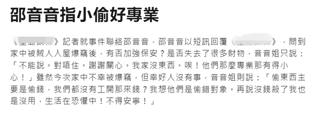 面對記者再次聯絡,邵音音婉拒回應,「不能說。對不起。謝謝關心。我家沒東西。唉!他們那麼專業,哪有得小心。偷東西主要是偷錢,我們都沒有工開哪來的錢?我想他們是偷錯對象了。再說,沒錢殺了我也是沒用的,生活在恐懼中,不得安寧。」