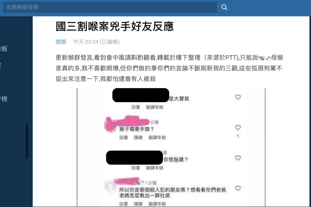 根據《TVBS》報導,楊姓男學生家屬崩潰的說「犯案學生是未成年,未來也不會留有案底,出來後對他來說根本不痛不癢,真的超級不公平,我們的家就這樣毀了」,而教唆的女學生與犯案郭男的IG也被網友肉搜出來,發現他們不僅毫無悔意,還發文訕笑,引起社會公憤。