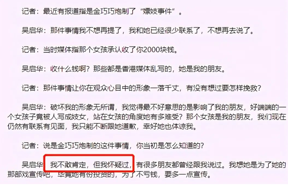 雖然和金巧巧戀愛期間,吳啟華一度還鬧出過招妓醜聞,他甚至懷疑是金巧巧幕後操縱了一切。