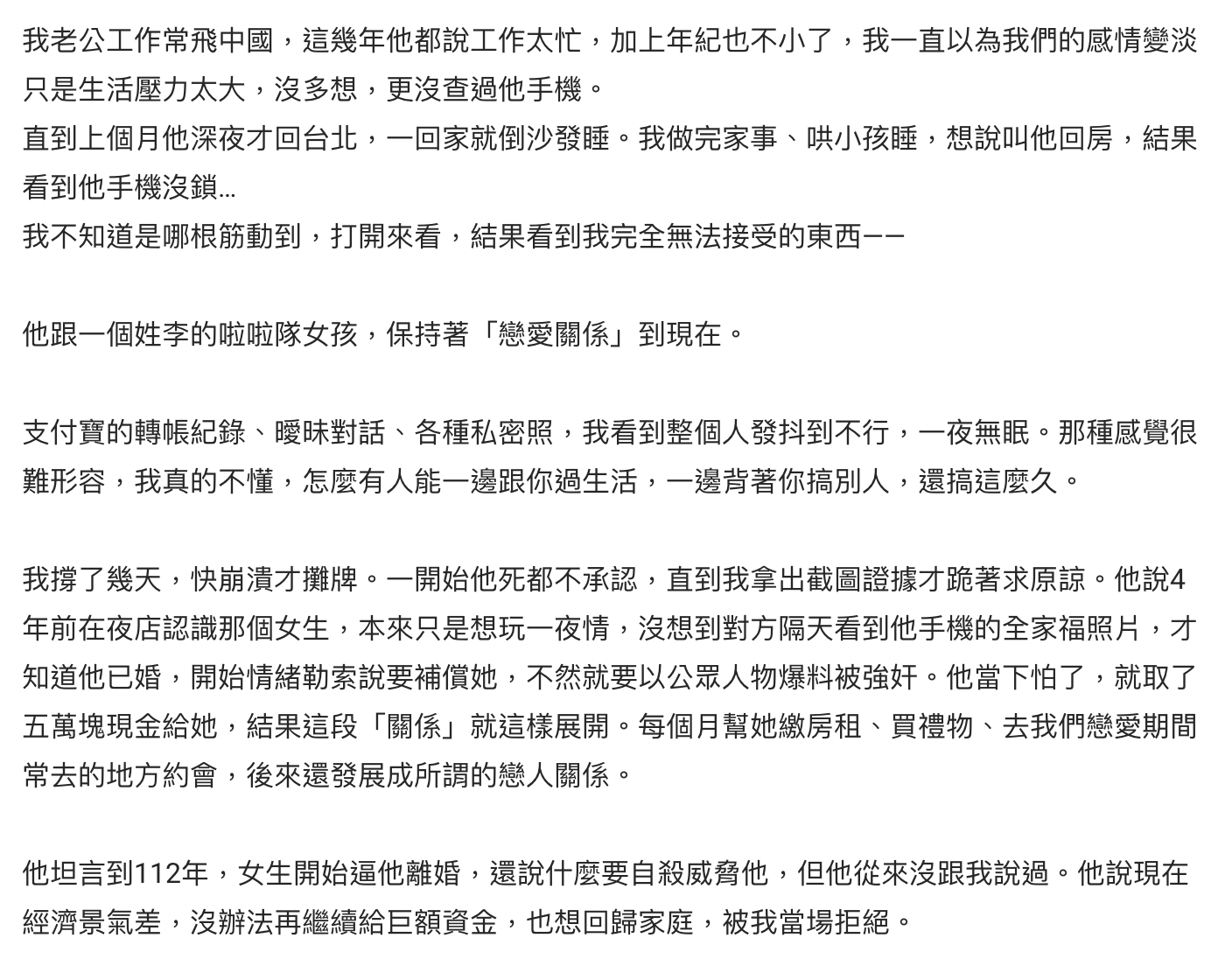 昨晚,有一名女網友發文指出,老公因為工作經常要往返兩岸,但總以「工作繁忙」為由,導致夫妻關係淡化。直到某天晚上,她意外發現老公手機的對話內容,發現他與一名啦啦隊女孩竟發展婚外情,對話內容更是鹹濕,期間還傳有私密照片,以及支付寶的轉帳紀錄,讓她大為震驚,馬上將上述證據全截圖保存,並和老公攤牌。