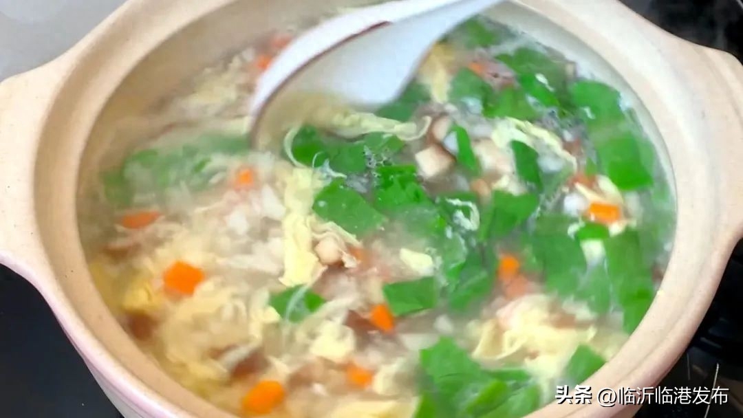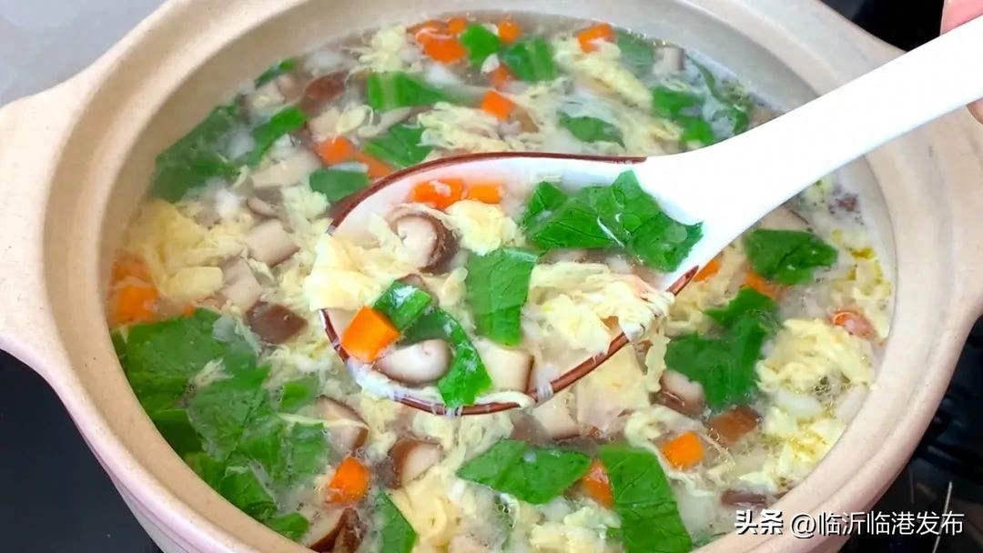2.這裡我們一定要準備一口砂鍋,砂鍋受熱均勻,口感好,加入適量的花生油不要太多,油熱先把香菇和胡蘿蔔丁加進來,翻炒均勻,炒至斷生后再加入多一點的自來水,大火燒開后,把剁好的山藥加進來,攪拌均勻,水再次燒開把雞蛋液轉著圈的淋入鍋中,等10秒鐘用勺子攪動一下,這樣才能很好地形成蛋花,然後加少許食鹽、雞精、白鬍椒粉,攪拌均勻,出鍋前再加入油麥菜,煮制斷生即可出鍋。這樣做的芙蓉山藥湯,湯鮮味美,健胃潤肺,一定要給家人多做一些喝。