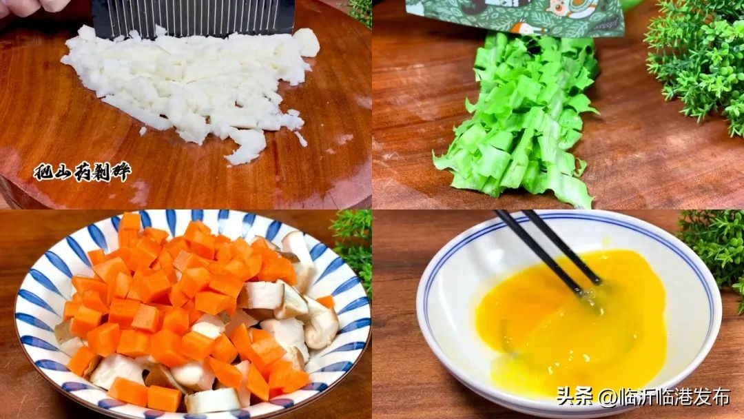 兩朵香菇,給它清洗乾淨,先切成薄片,再切成小丁,切好放入碗中。一根胡蘿蔔,也切成丁,切好和香菇放在一個碗中。一小把油麥菜,洗凈后切成小段,切好放碗中備用,一顆雞蛋打進一個小碗里,用筷子攪散攪均勻後備用。
