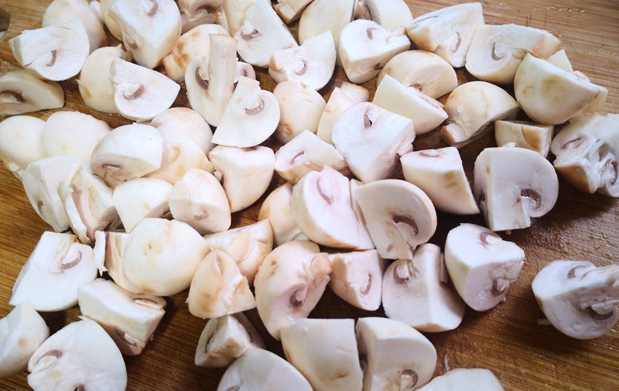 1.先將口蘑用清水沖洗2次,洗掉表面粘附的髒東西,然後再放到淡鹽水中浸泡5~10分鐘,目的是清洗的更徹底。接著再次沖洗乾淨後,將其根部較髒的部分去掉,再切成4半備用。