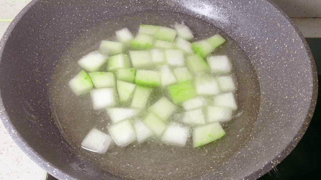 2、準備一塊冬瓜,冬瓜的表皮比較硬,去皮時要小心,盡量用鋒利的刀子處理到位。去皮後的冬瓜一分為二,再把白色的瓜瓤取出來,最後把它切成大小一樣的小方塊,放入清水中沖洗一下表面的粘液。鍋中倒油,把冬瓜放進去大火快速的翻炒,鎖住裡面營養,炒至微黃後往鍋中倒入適量的清水。