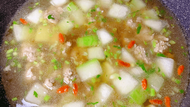 3、大火把鍋中的水煮開,轉中火煮5分鐘,把冬瓜煮到7分熟後,把肉餡用勺子團成小圓形放入鍋中,然後放入適量的鹽和枸杞力,小火煮1分鐘,丸子和冬瓜全部煮熟後關火。