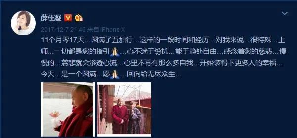 2017年12月7日,薛佳凝公開了自己皈依佛門的消息,並大方分享自己的修行過程。