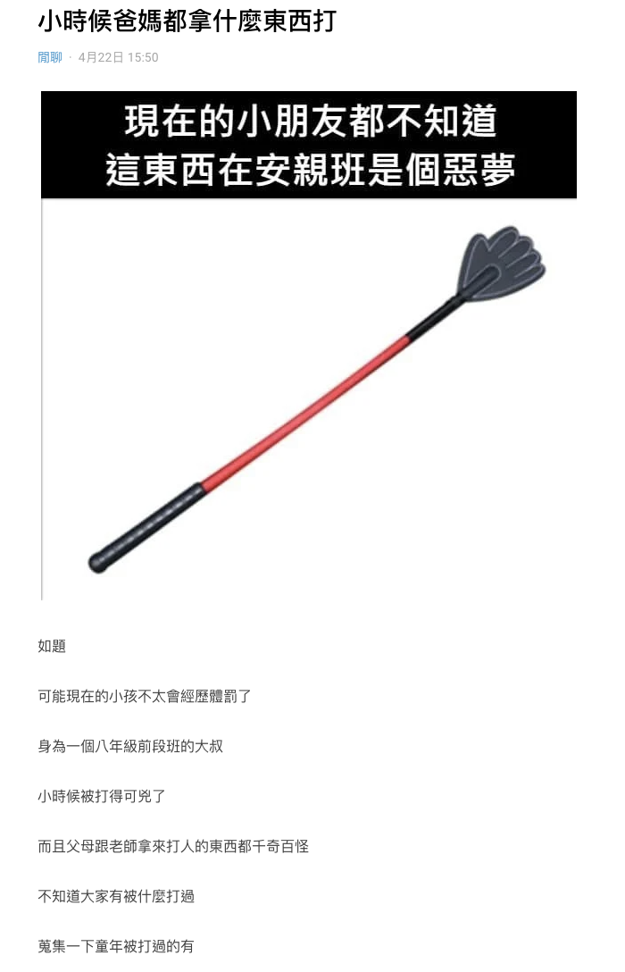 根據《聯合報》報導,有網友在「Dcard」上分享童年回憶,表示身為8年級前段生的他,經歷過被狠狠修理的時期,不論是爸媽或是老師,總會有千奇百怪的方式來達到體罰的目的,好奇問大家:「小時候爸媽都拿什麼東西打?」更以經驗談來分享6款樣品,分別是「黃色水管」、「雞毛撢子」、「衣架」、「愛的小手」、「熱融膠」、「藤條」,馬上勾起童年回憶。