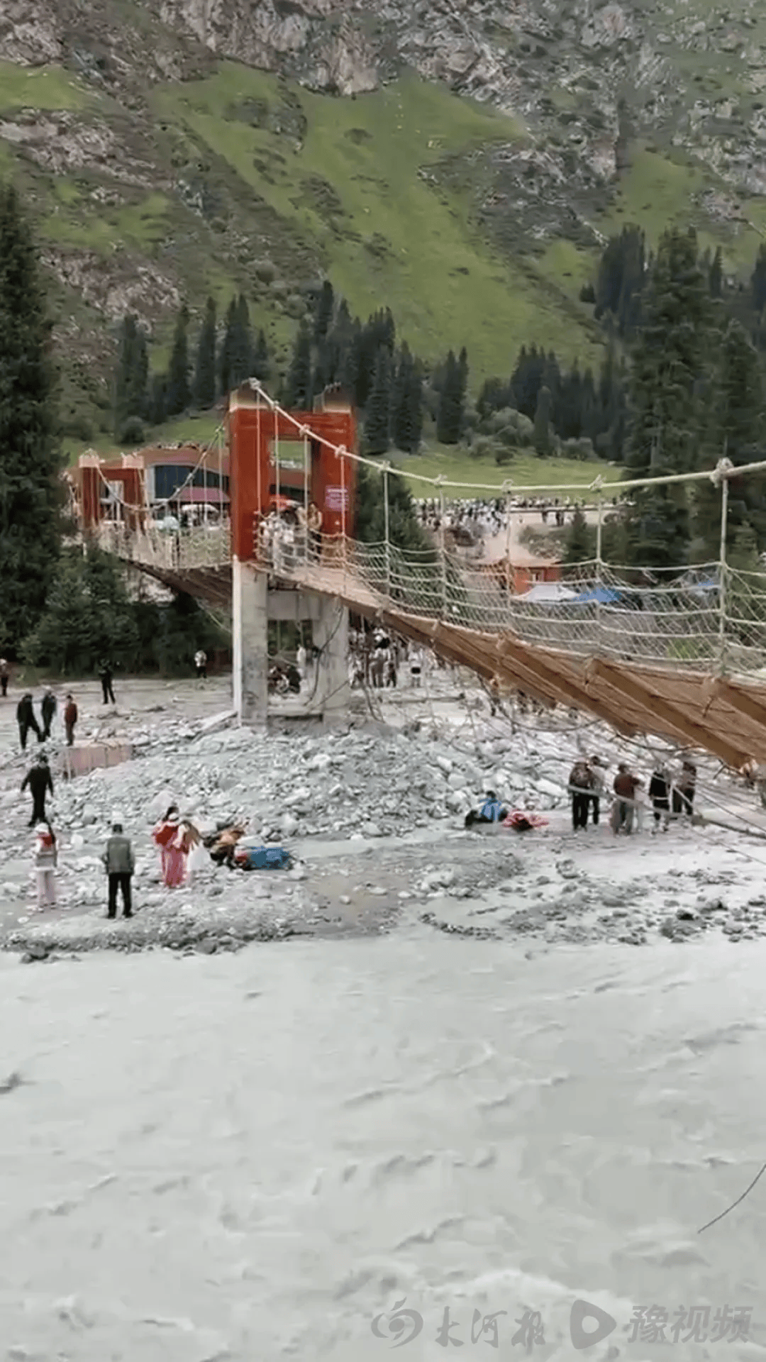 據大河報此前報道,8月6日,新疆伊犁州昭蘇縣夏塔旅遊風景區內,一座吊橋發生繩索斷裂,橋面傾斜,有部分遊客從橋上跌入湍急河流中。遊客拍攝的影片畫面顯示,該橋一側繩索斷開,橋面向斷繩一側傾斜,部分遊客被困橋上,部分遊客躺倒在碎石堆上,現場有直升機進行救援。拍攝者稱「剛剛橋塌了,我們從橋上摔下來,有人被沖走了」。