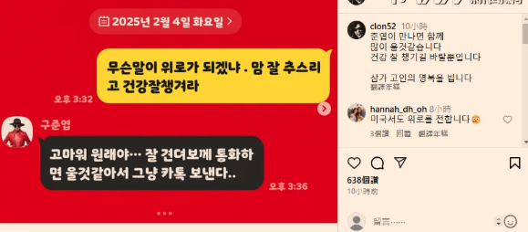 至於具俊曄目前近況,《yahoo新聞》指出,近日姜元來在社群平台分享與具俊曄的私訊內容。2月4日,姜元來傳訊要好友保重身體,具俊曄回覆表示,怕自己忍不住哭出來,才選擇不接電話僅以訊息交談,但他也堅強表示「謝謝你,我會努力撐下去」要友人別擔心。姜元來則透過貼文為摯友打氣,希望他能堅強度過這段艱難時期。