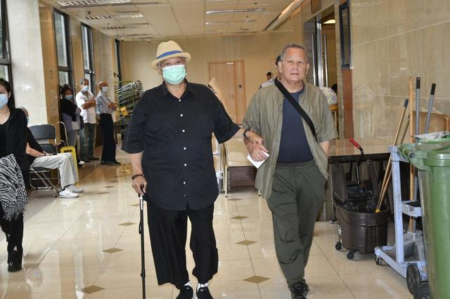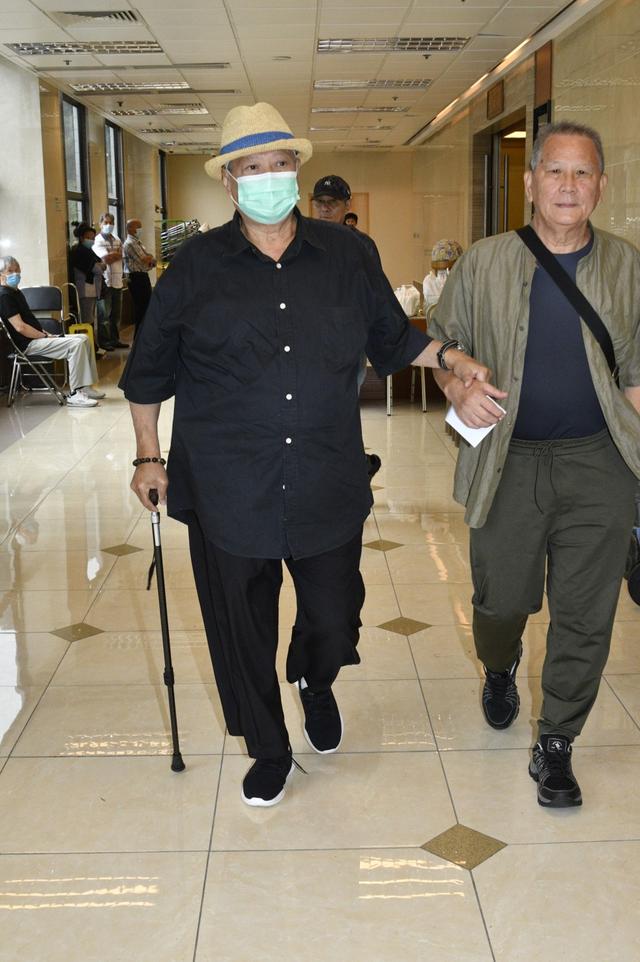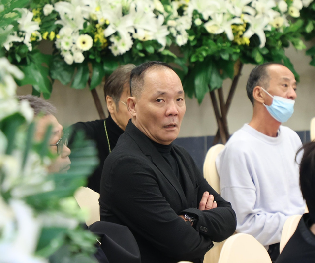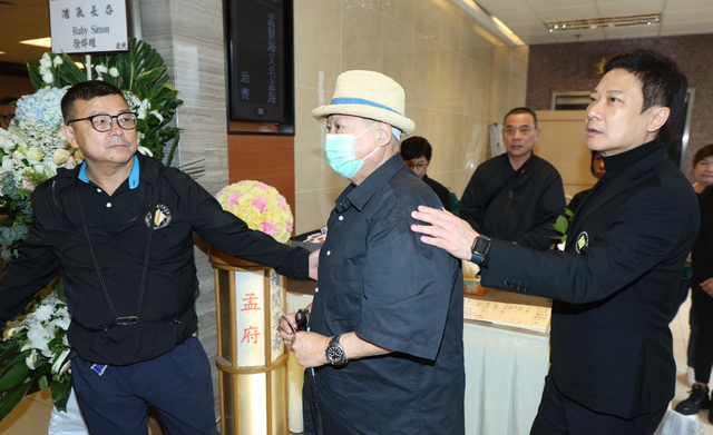 洪金寶當天與一名老者現身靈堂,二人相互攙扶,心情悲痛。